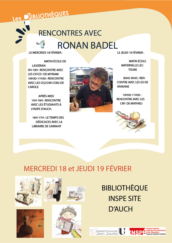 Le 18 février 2026, l'auteur et illustrateur Ronan Badel viendra à la rencontre des étudiants en master 1 et en master 2 à l’INSPE d’Auch.
